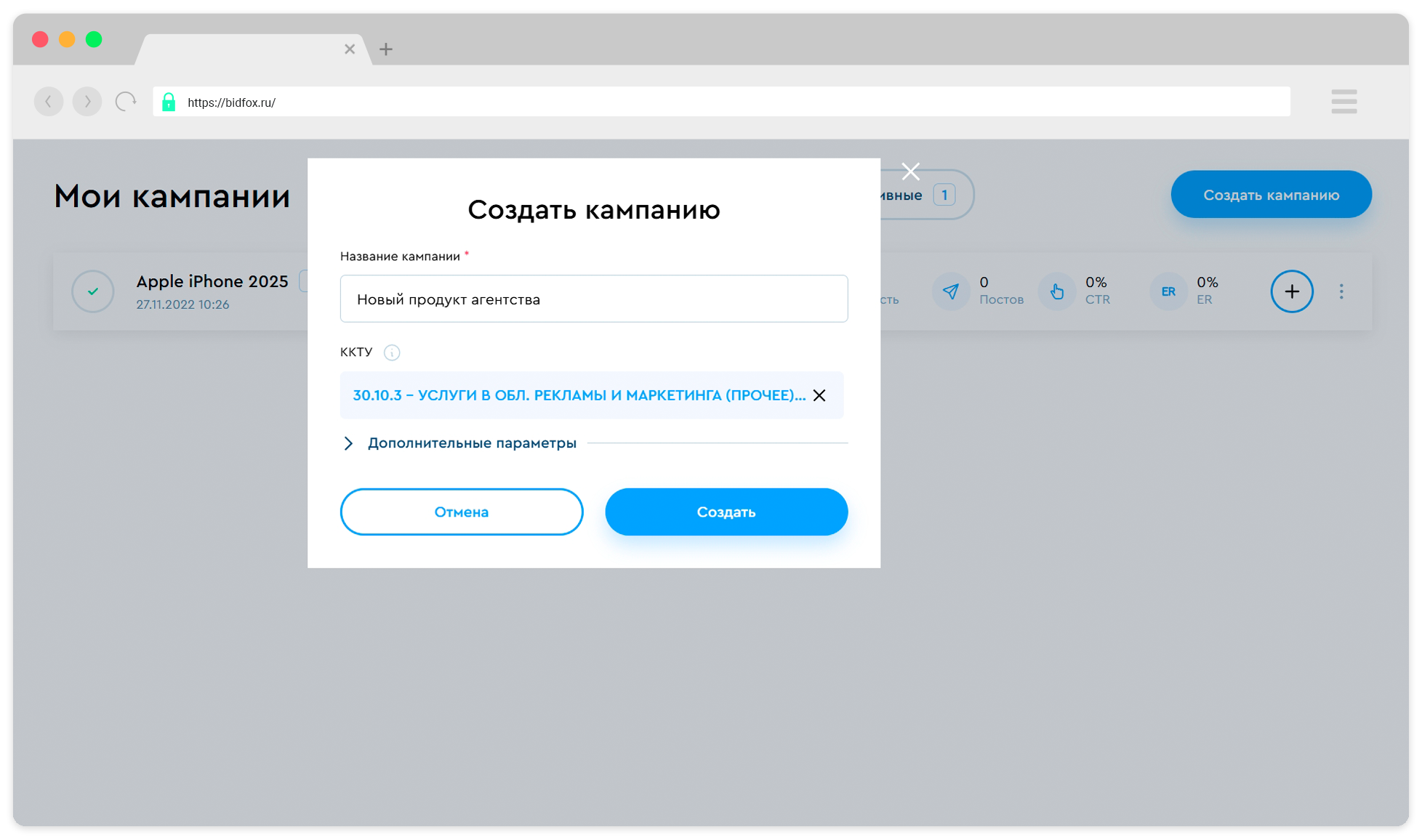 Присвойте кампании название и выберите ККТУ.