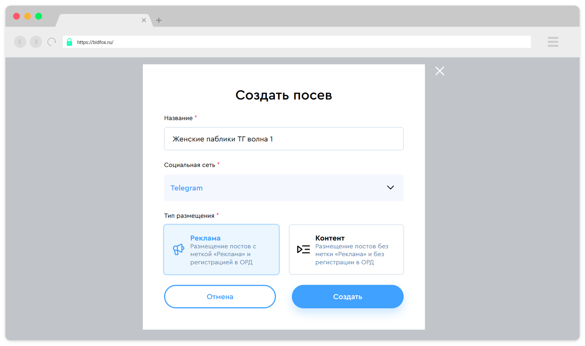Определите тип размещения: «Реклама» с автоматической маркировкой или «Контент» для постов в виде инфоповода без рекламной пометки.