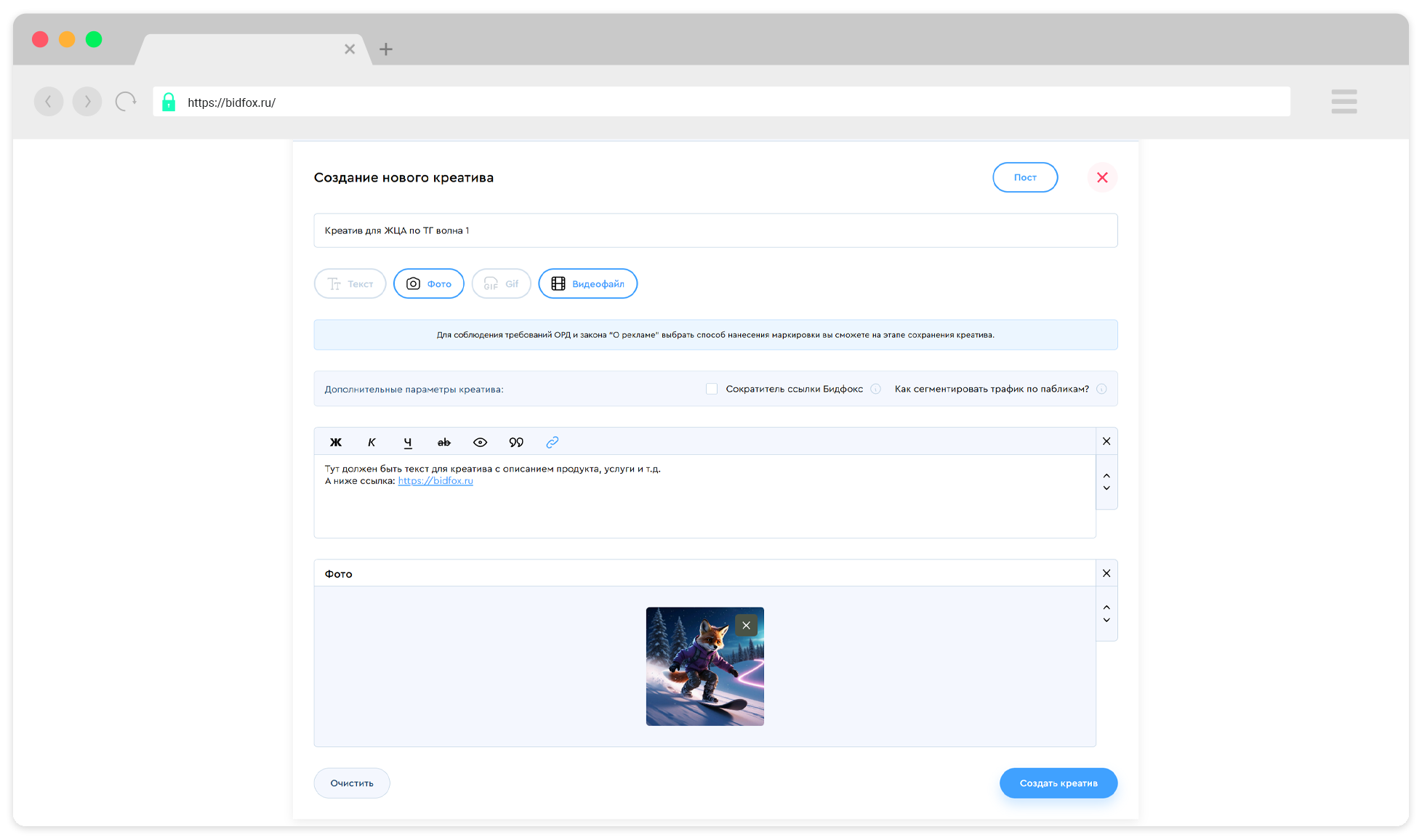 Заполните, кто запускает рекламные посевы — это важно для корректной маркировки и учета кампаний.