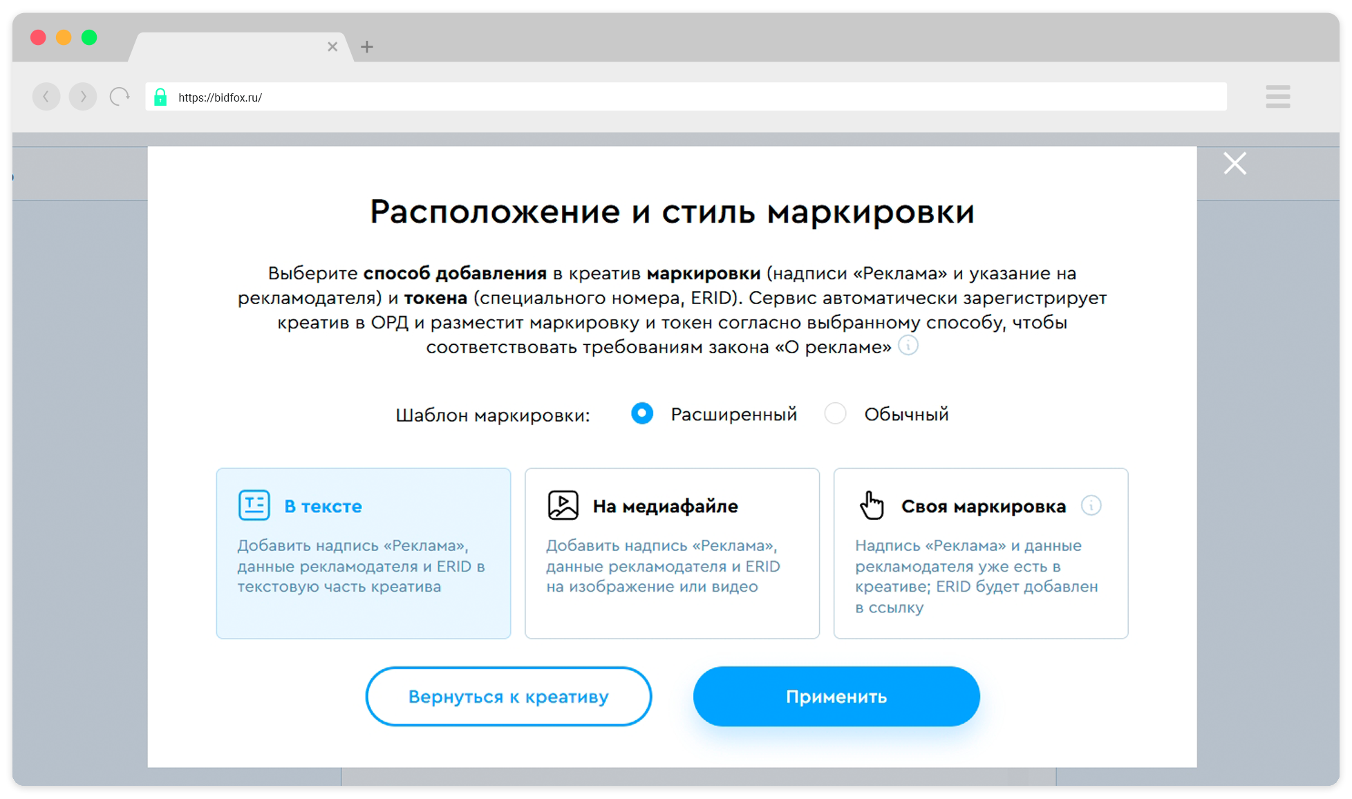 Здесь же задается расположение маркировки: её можно встроить прямо в текст или аккуратно разместить на визуале.