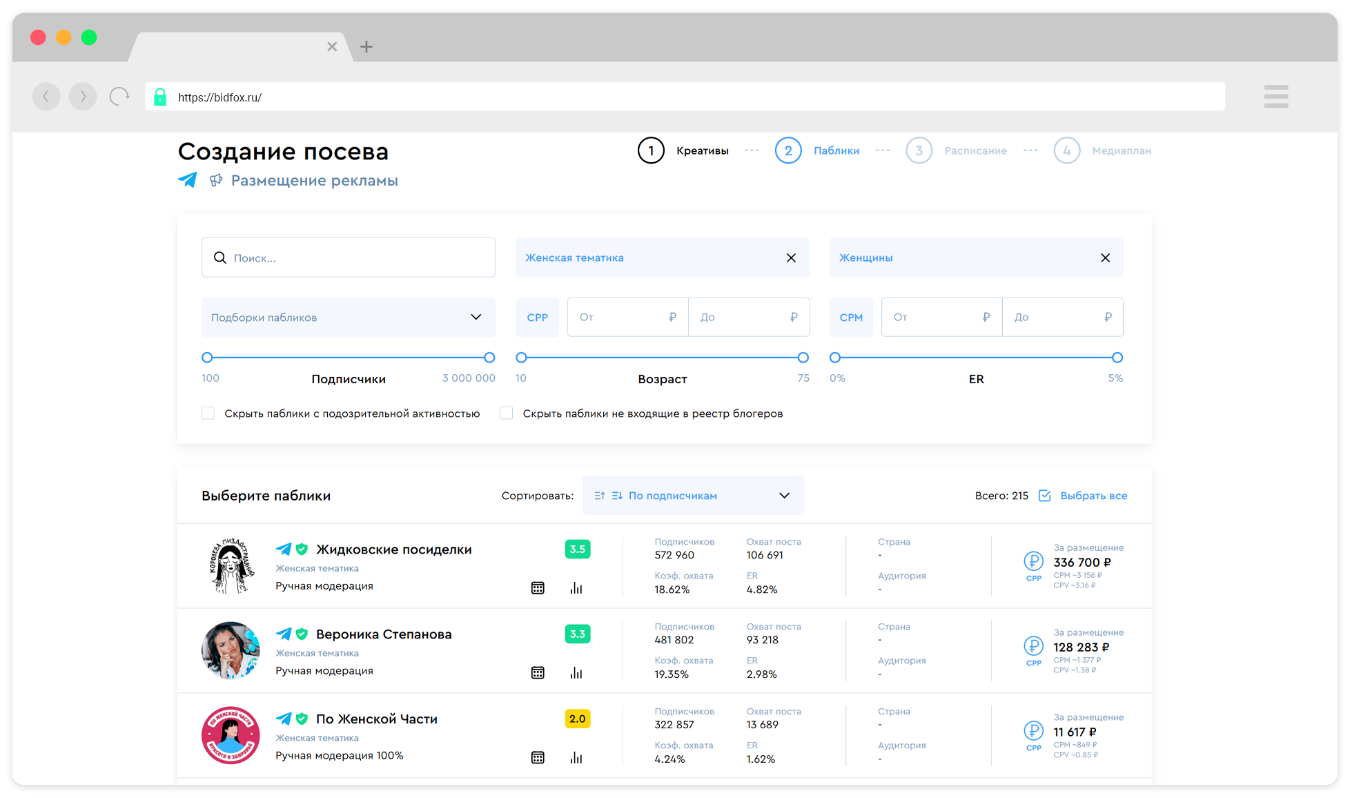 Фильтруйте площадки по подписчикам, стоимости, вовлеченности, теме, полу и возрасту аудитории, чтобы оставить только релевантные варианты.