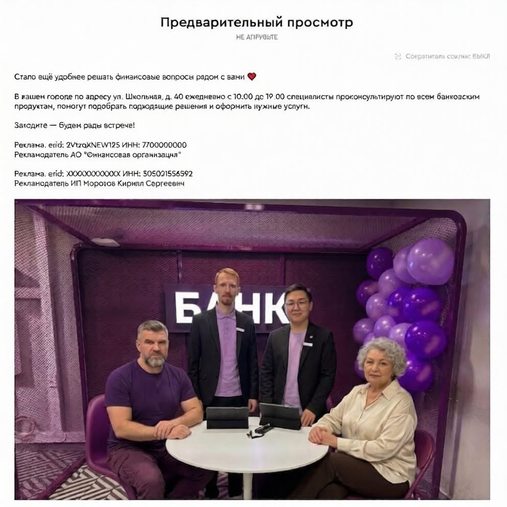 Креативы прошли автоматическую модерацию и были корректно промаркированы через BidFox. Сервис обеспечил:
